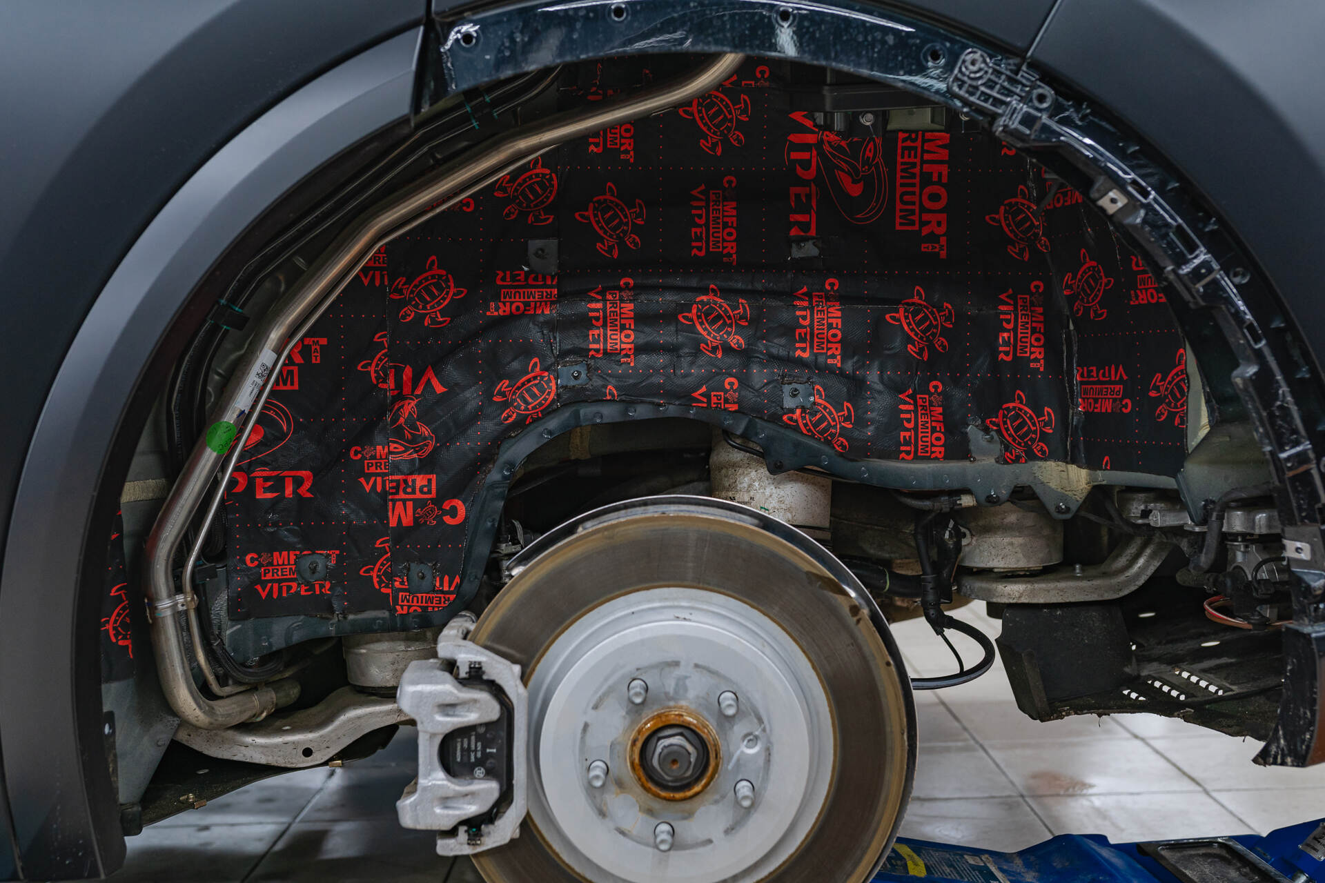 Шумка арок Lixiang L7 2025 стартует со снятия колес и пластиковых подкрылок, причем все манипуляции выполняются максимально бережно и аккуратно. На металлическое основание мастера в два слоя накладывают плотный вибропласт, который тщательно раскатывается специальным роликом для безупречного прилегания. Создание такого монолитного покрытия без малейших зазоров критически важно для эффективного гашения дорожных вибраций и блокировки внешних звуков. Благодаря плотному контакту материала с поверхностью кузова устраняются резонансы, что радикально снижает уровень шума в салоне. Тщательная прикатка листов гарантирует долговечность защиты и ее высокую эффективность в самых суровых условиях эксплуатации.