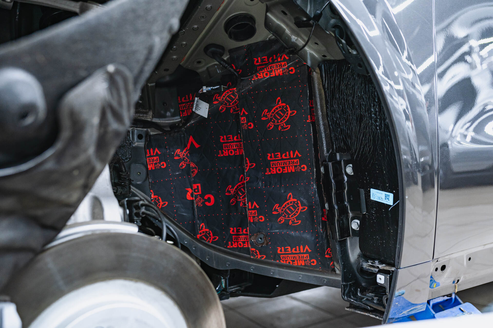 Начальный этап шумоизоляции колесных арок Lixiang L6 включает снятие колес и пластиковых подкрылок для обеспечения доступа к внутренней поверхности арок. Мы уделяем максимум внимания деталям: после подготовки зоны на арки наносится первый слой вибропласта — материала, который эффективно подавляет вибрации кузова, особенно заметные при движении по неровным или гравийным дорогам. Этот важный этап закладывает основу для последующей многослойной изоляции, что в итоге превращает поездку в плавное и тихое путешествие.