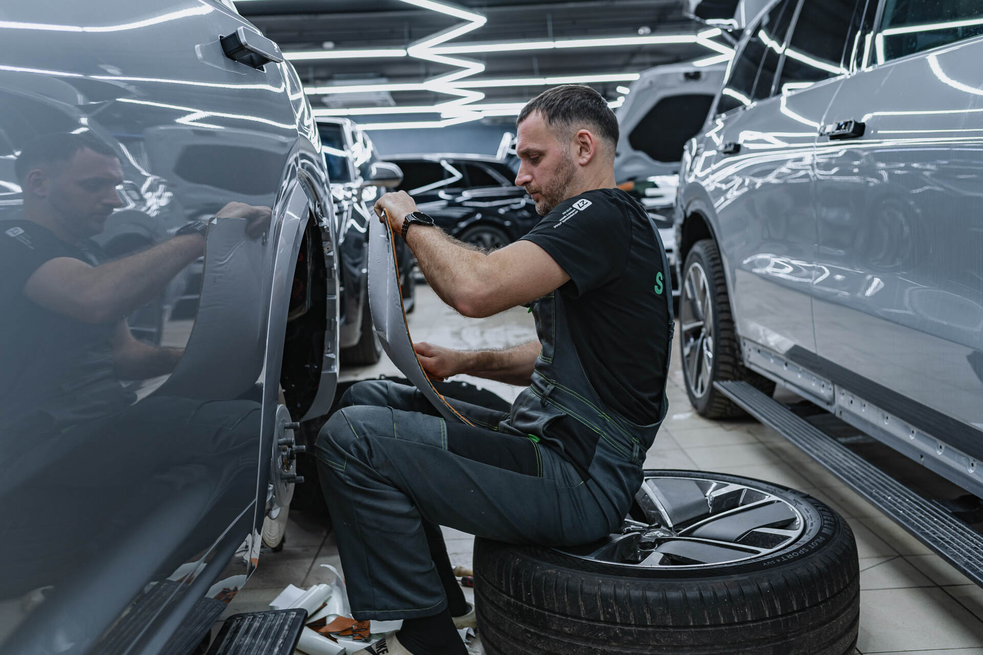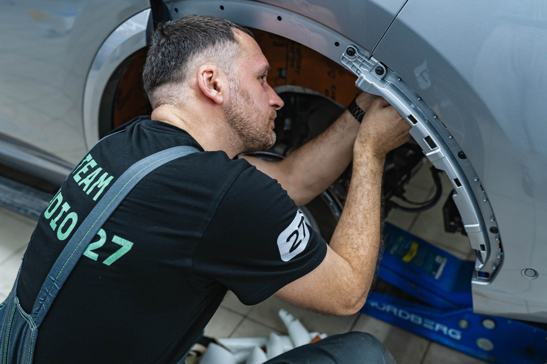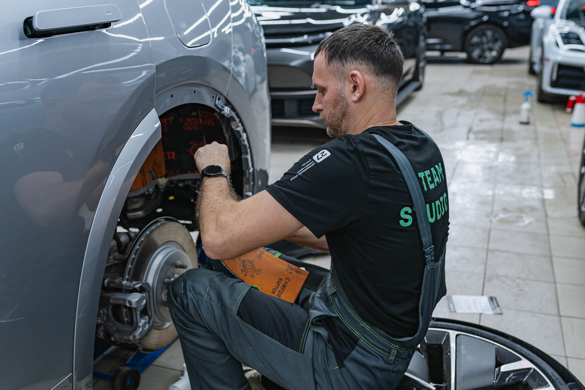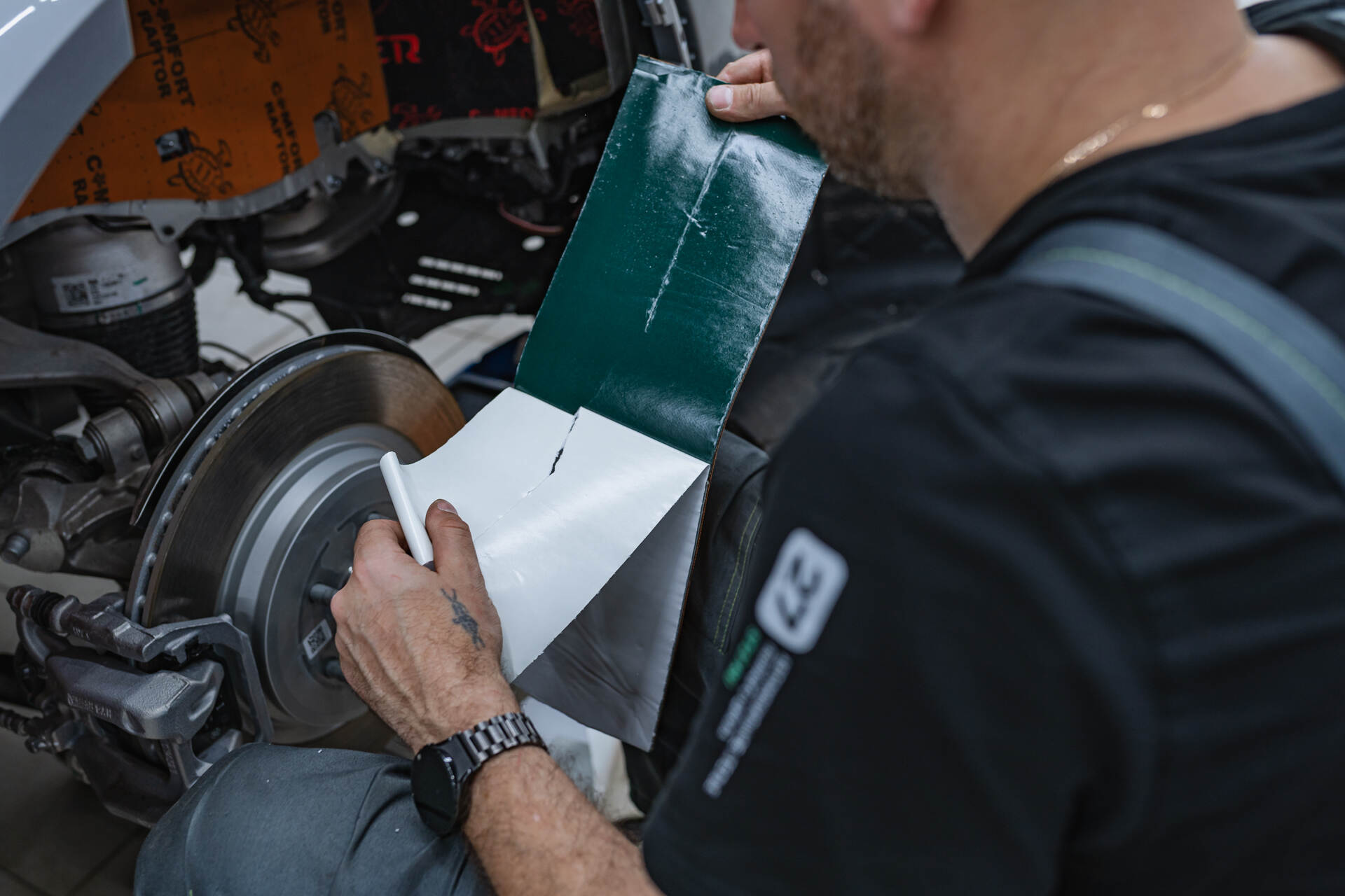 Работа по шумке арок Lixiang L7 начинается с демонтажа колес и подкрылок для доступа к колесным аркам: первым слоем мы наносим вибропласт, который эффективно гасит структурные колебания кузова при движении по гравию или неровностям. Второй слой материала со специфической структурой тщательно укатывается валиком, что исключает появление воздушных полостей и создает монолитное виброгасящее покрытие. Финальным этапом становится установка мембранного полотна, которое надежно фиксирует предыдущие слои и нейтрализует остаточные резонансы. В результате колесные арки превращаются в многослойный звуковой барьер, обеспечивающий исключительную тишину и плавность хода.