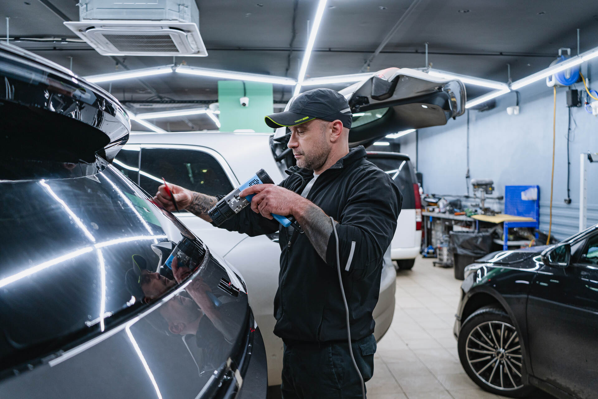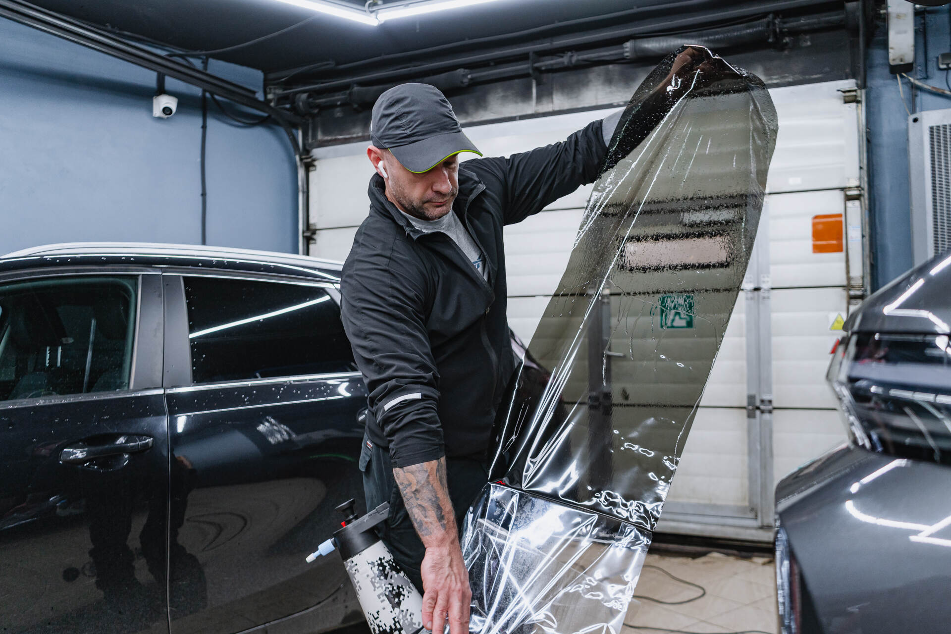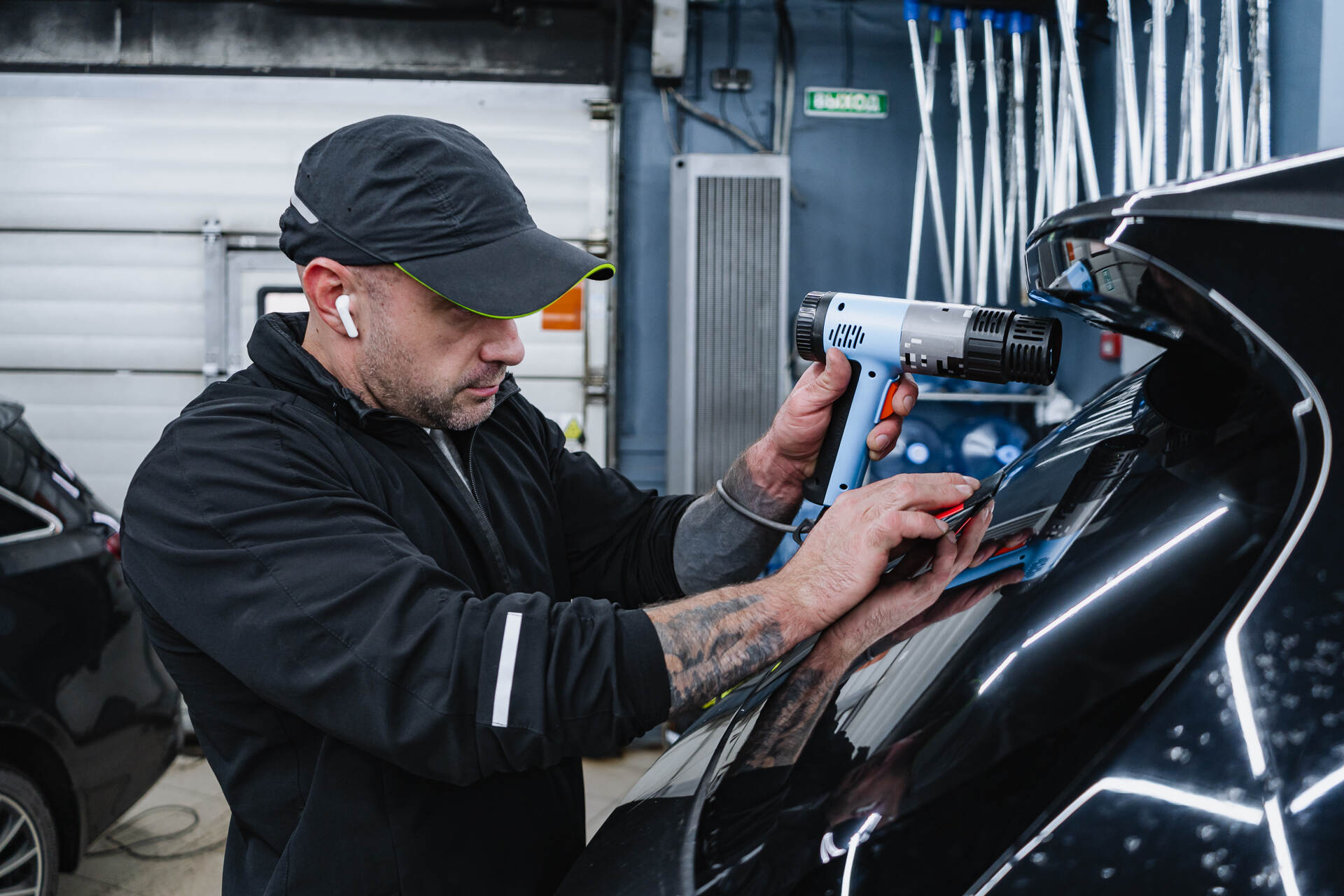 Тонировка задней полусферы Лисян Л7, как и все аналогичные работы, занимает около трёх часов. Эта процедура у нас хорошо отлажена, и мы тонируем несколько автомобилей в день благодаря огромному опыту наших мастеров; их умелые руки гарантируют отличный результат, и клиенты всегда уезжают от нас довольными. Работа начинается с тщательной мойки стёкол, затем мы готовим саму плёнку: вырезаем нужный кусок из общего рулона, накладываем его с внешней стороны стекла и лезвием корректируем форму, точно повторяя изгибы. После этого плёнка прогревается строительным феном, промывается мыльным раствором и окончательно наносится на стекло уже изнутри салона.