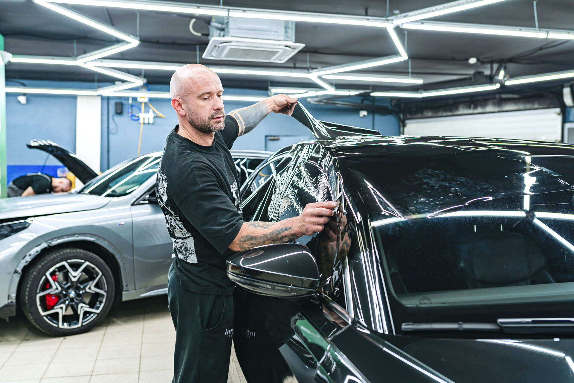 А поскольку пожелания клиента для нас являются приоритетом, мы приступили к оклейке лобового стекла плёнкой LLumar ATR50 с коэффициентом светопропускания 53%, а передние боковые оклеим более тёмной плёнкой LLumar ATR15 (светопропускание 18%). Пленка LLumar американского производства обладает существенными преимуществами по сравнению с бюджетными аналогами. Дешевые материалы обычно начинают выцветать уже через полгода эксплуатации. Кроме того, некачественная тонировка подвержена образованию царапин от контакта со стеклоподъемниками, что значительно ухудшает их внешний вид за тот же период.