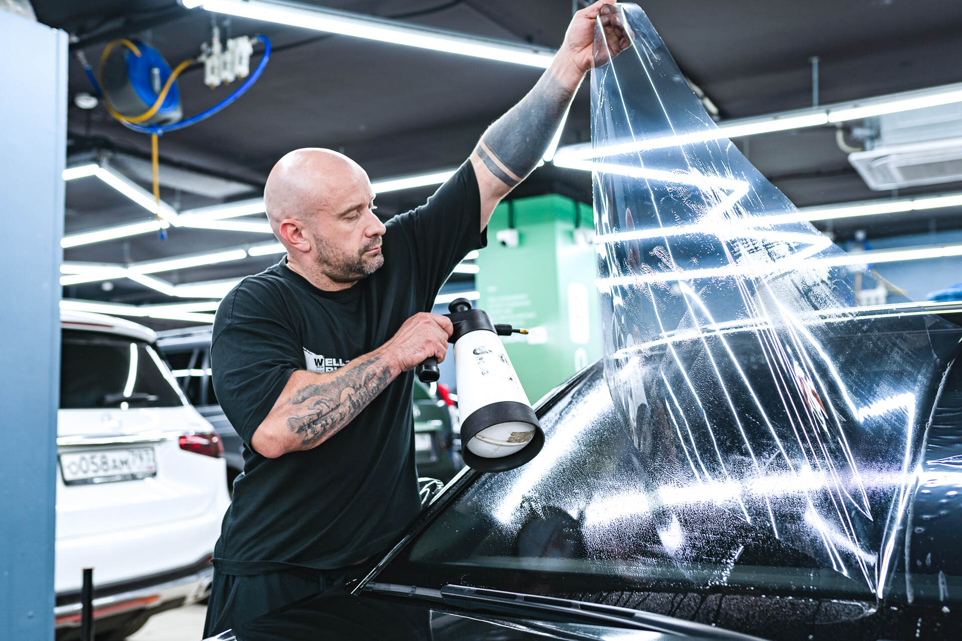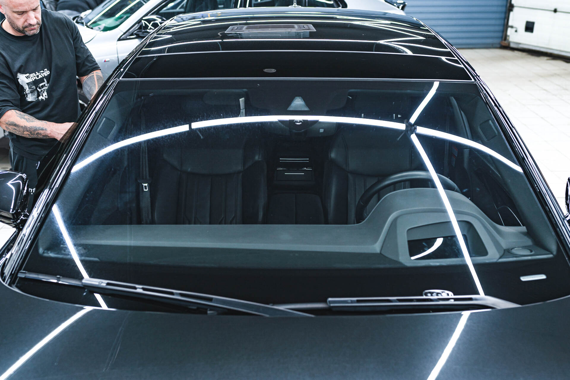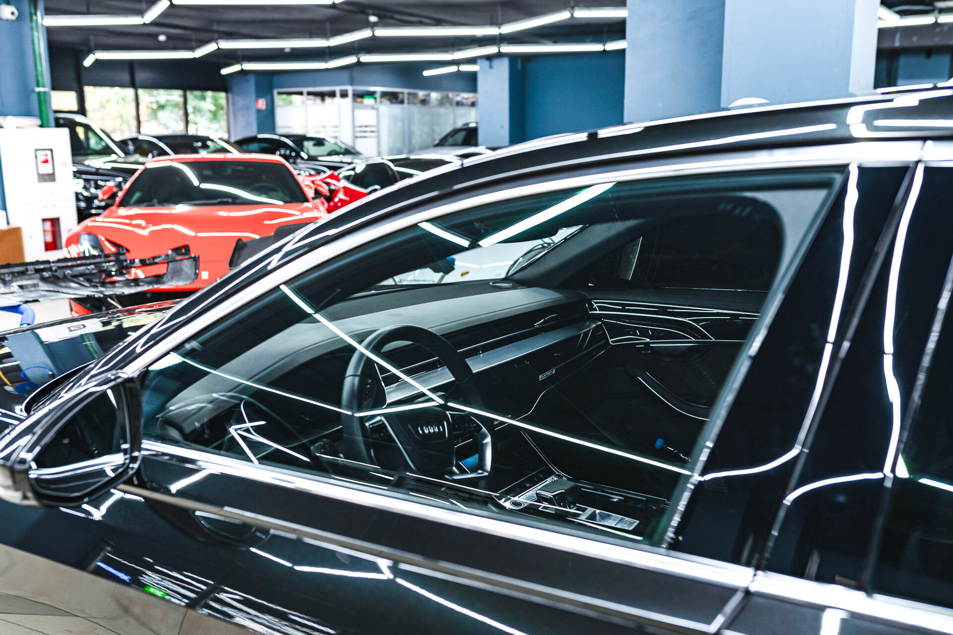 Процесс тонирования передних стекол Audi A8 занимает в среднем от трёх до шести часов — наши специалисты сочетают в работе оперативность и безупречное качество. Работы начинаются с тщательной мойки и обезжиривания стеклянных поверхностей, после чего подготавливается сам материал. Из рулона с пленкой выкраиваются три куска для боковых и лобового стекол, которые в самом начале работы размещаются с внешней стороны для корректировки размеров лезвием и термической обработки промышленным феном. Подготовленные элементы обрабатываются мыльным раствором и наносятся на стёкла изнутри салона – эта процедура требует высокой точности — любая ошибка может привести к порче дорогостоящего материала, однако опыт наших мастеров гарантирует безупречный результат, что подтверждается доверием к нашей компании владельцев новых и премиальных автомобилей. В процессе нанесения тонировочная пленка тщательно выравнивается ракелем, после чего стекла прогреваются строительным феном. Термическая обработка активирует адгезивные свойства материала, обеспечивая его полное слияние с стеклянной поверхностью. Важным условием является не опускать-поднимать боковые стёкла в течение четырех дней с момент завершения работы — этот период необходим для полной полимеризации пленки LLumar. В дальнейшем эксплуатация подъемника стекол будет абсолютно безопасной для тонировочного покрытия. Хотя полностью затонированный автомобиль Audi A8 приобретает солидный внешний вид, главным преимуществом остается практическая польза — снижение интенсивности солнечного излучения в салоне и создание комфортных условий для всех пассажиров транспортного средства.