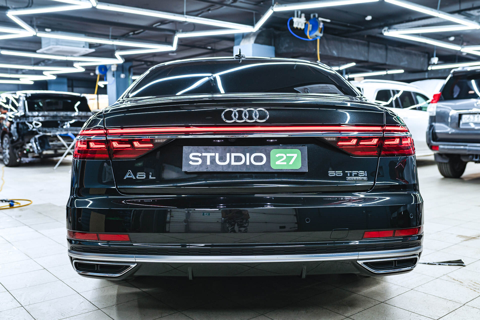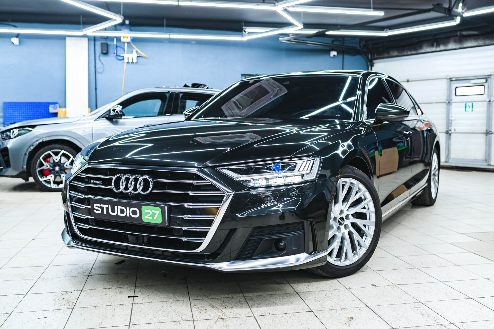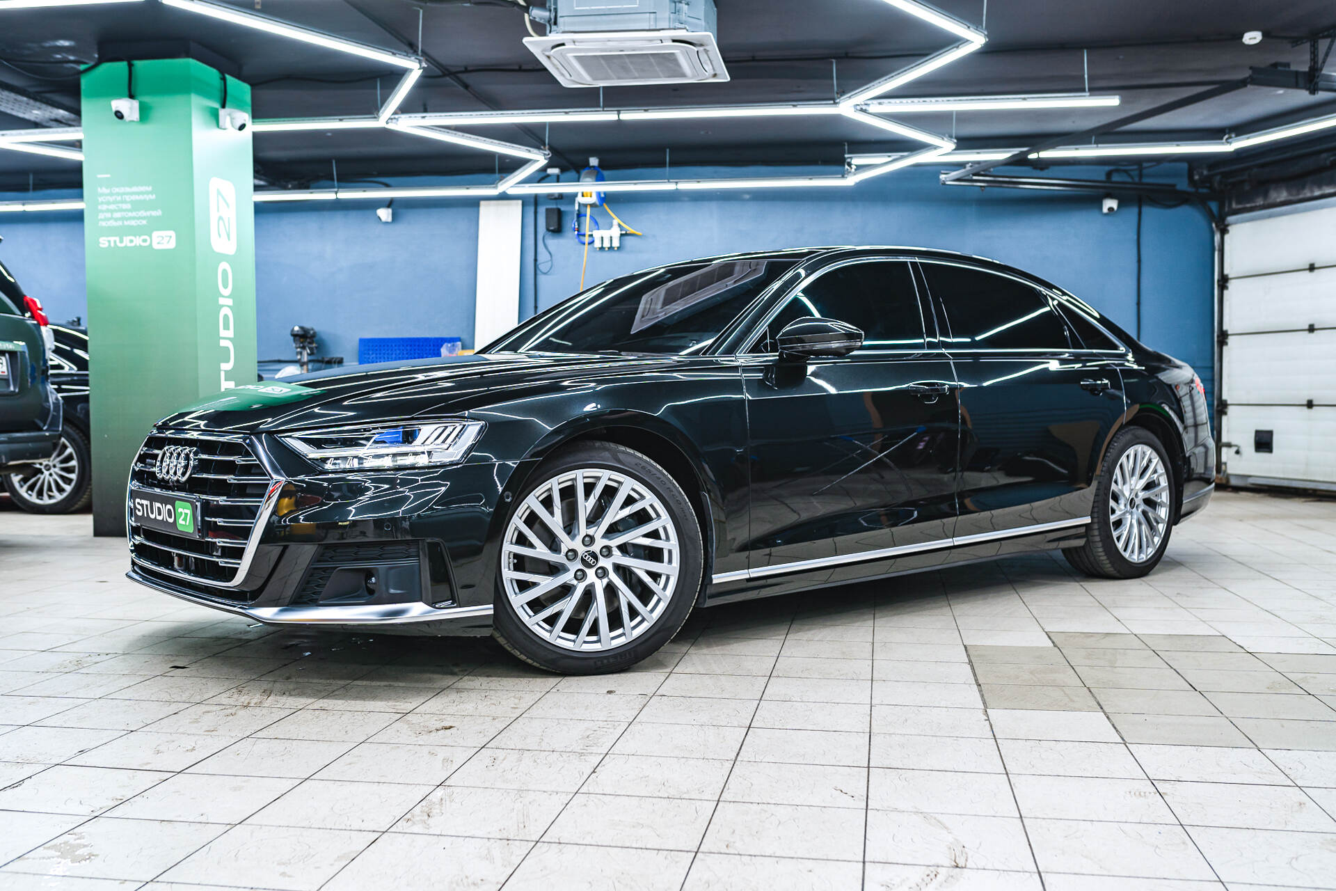 В своей автостудии мы предоставляем крайне широкий и многообразный спектр услуг для самых разных автомобилей, в том числе мы производим тонировку стёкол классической тёмной плёнкой. Вот в данном кейсе мы и поговорим о тонировке передних стекол Audi A8 – будем тонировать лобовое стекло и два передних боковых. Задняя часть автомобиля уже имела затемнение, и клиент стремился добиться единого стиля транспортного средства. Хотя полное тонирование придает автомобилю солидный вид, следует учитывать, что такое решение противоречит требованиям ГОСТ. В Москве, Санкт-Петербурге и некоторых других крупных городах дорожная полиция часто не обращают внимания на подобный тюнинг, однако в южных регионах водителей могут обязать удалить тонировку непосредственно на месте с одновременным штрафованием – тут уже каждый решает сам для себя.