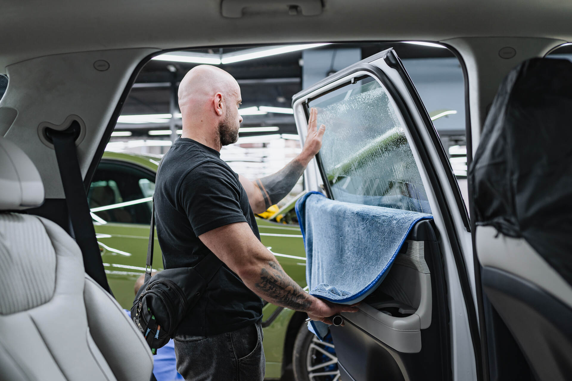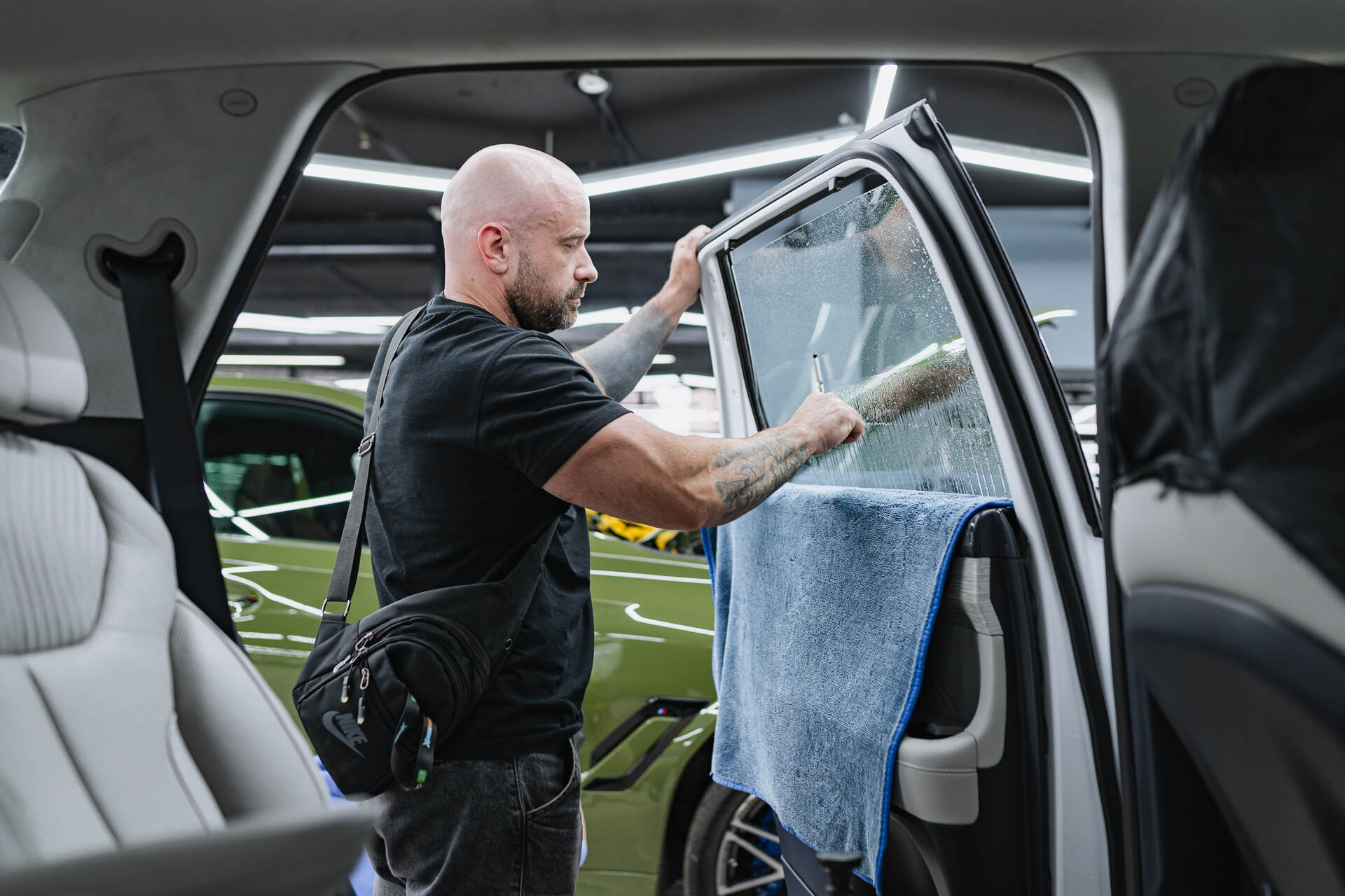 Подготовка пленки с внешней стороны стекол к поклейке изнутри.