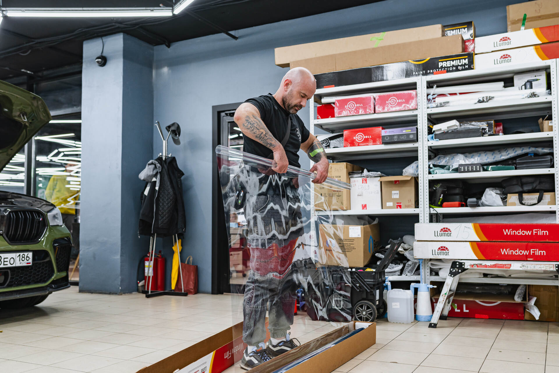 Теперь давайте подробнее рассмотрим материалы, использованные в этом проекте. Основное внимание уделим тонировочной плёнке LLumar ATR15. Её уровень светопропускания составляет всего 18%, и внешне она напоминает обычную затемняющую плёнку, которую можно встретить в любой мастерской. Однако ключевое отличие американской продукции LLumar от дешёвых китайских аналогов заключается в её составе. Бюджетные плёнки часто блокируют только инфракрасное излучение, тогда как наша плёнка обеспечивает комплексную защиту, задерживая как ИК-лучи, так и ультрафиолет. Именно ультрафиолетовый спектр в значительной степени отвечает за нагрев салона, что может приводить к дискомфорту и даже ухудшению самочувствия водителя и пассажиров во время длительных поездок в солнечную погоду. Особенно чувствительны к такому воздействию пожилые люди и дети, поэтому мы рекомендуем позаботиться о защите заранее.