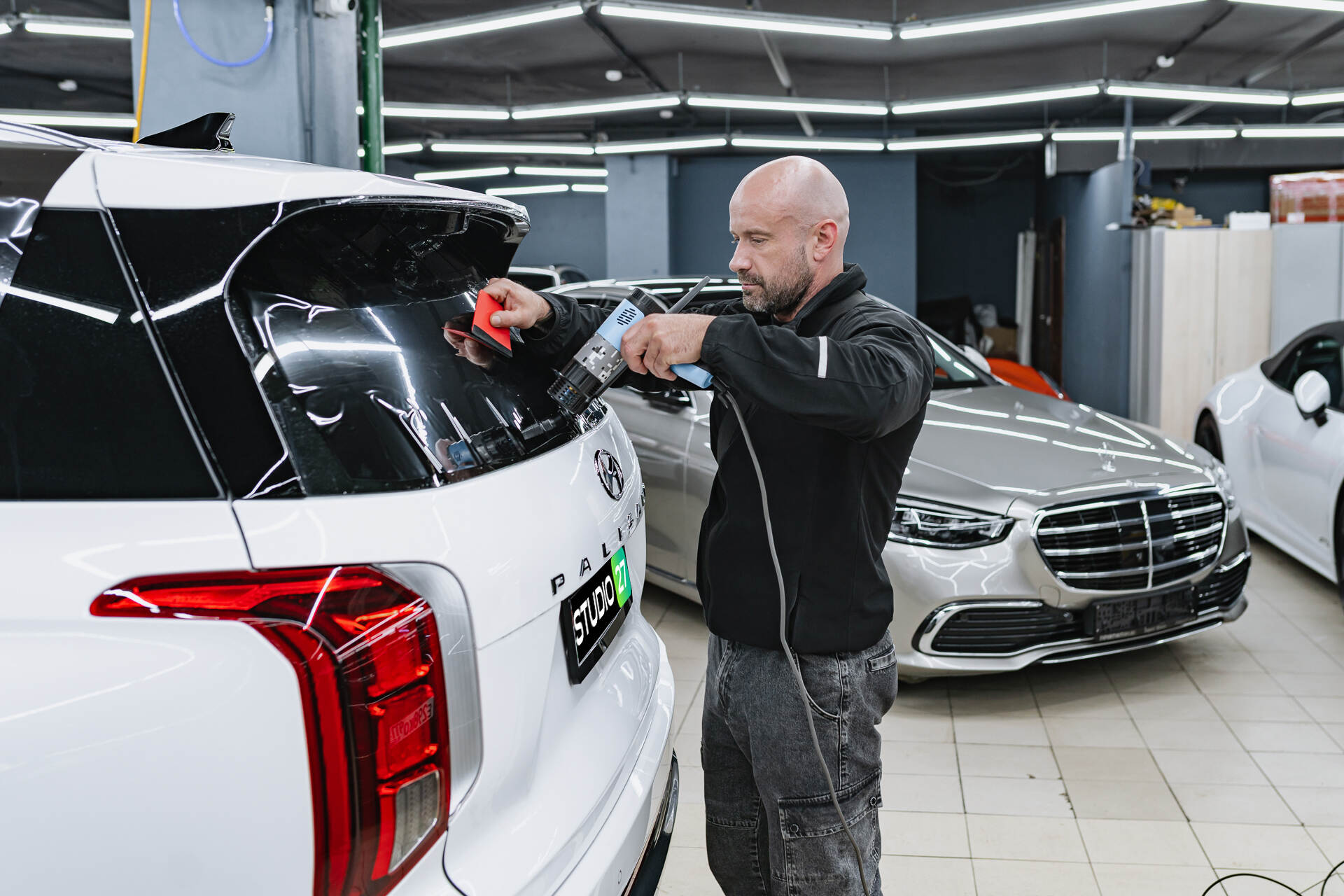 В нашу автостудию обратился владелец Hyundai Palisade с желанием выполнить полную тонировку автомобиля. Мы будем тонировать как заднюю, так и переднюю часть. На задние стекла наклеим стандартную затемняющую пленку LLumar ATR15, а для передних стёкол выберем атермальную пленку LLumar Air 90 SR HPR: она не только защищает салон от перегрева, но и является практически прозрачной, имея лишь лёгкий зелёный оттенок. Важно, что эта плёнка полностью соответствует ГОСТ 5727-88, а значит, её использование на передних стеклах абсолютно законно и не повлечёт за собой штрафов, в отличие от применения на них затемнённых материалов, что, как известно, запрещено.