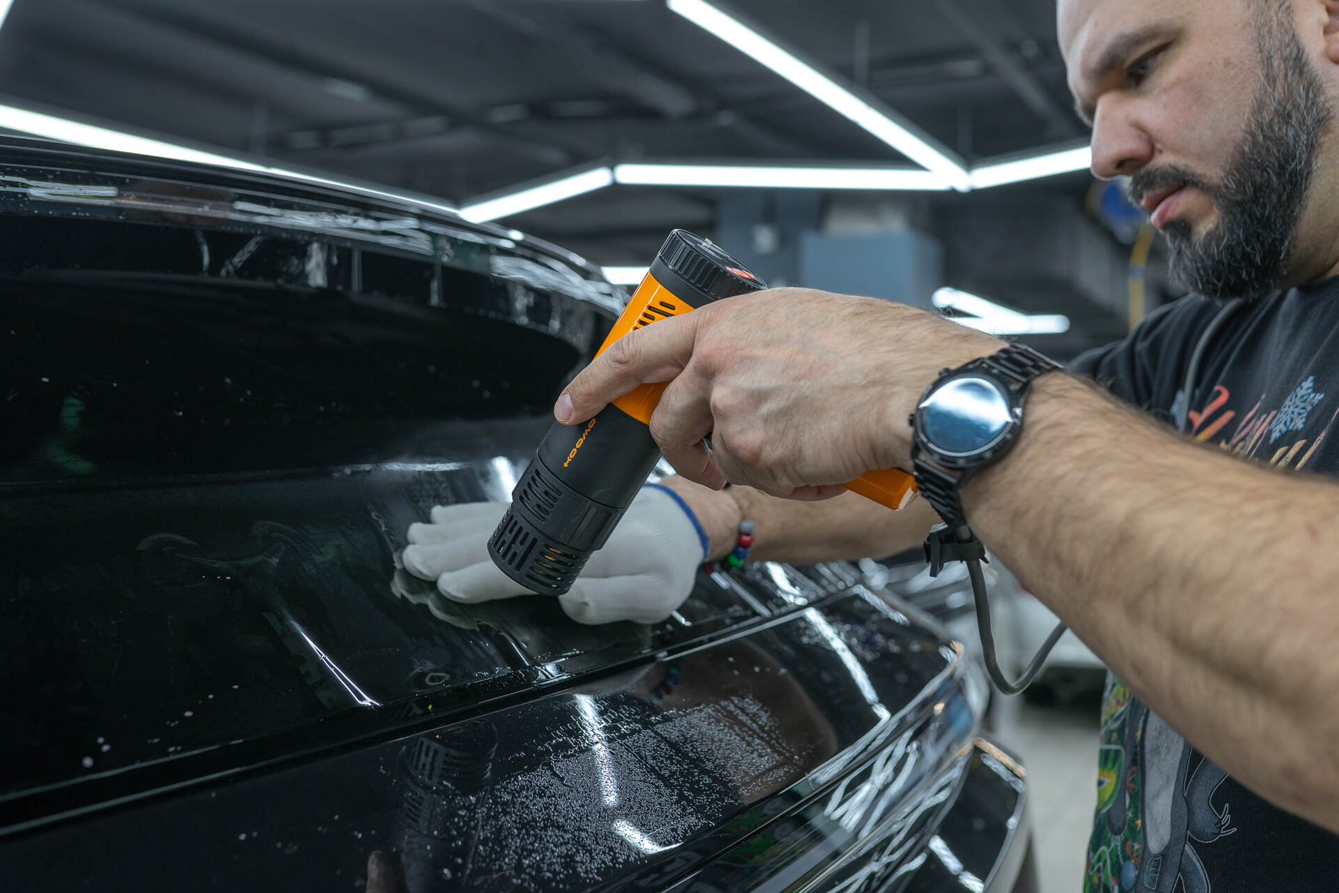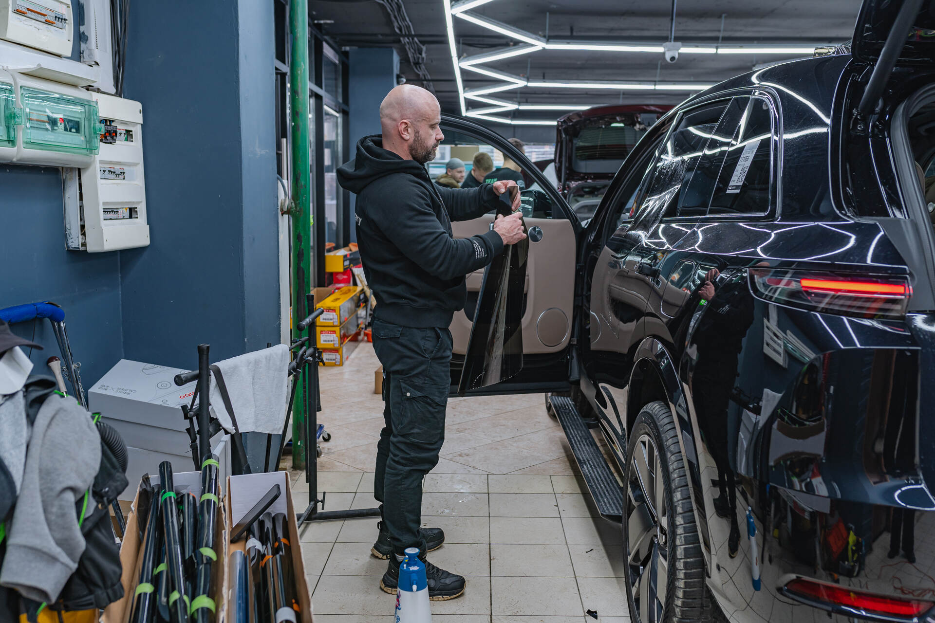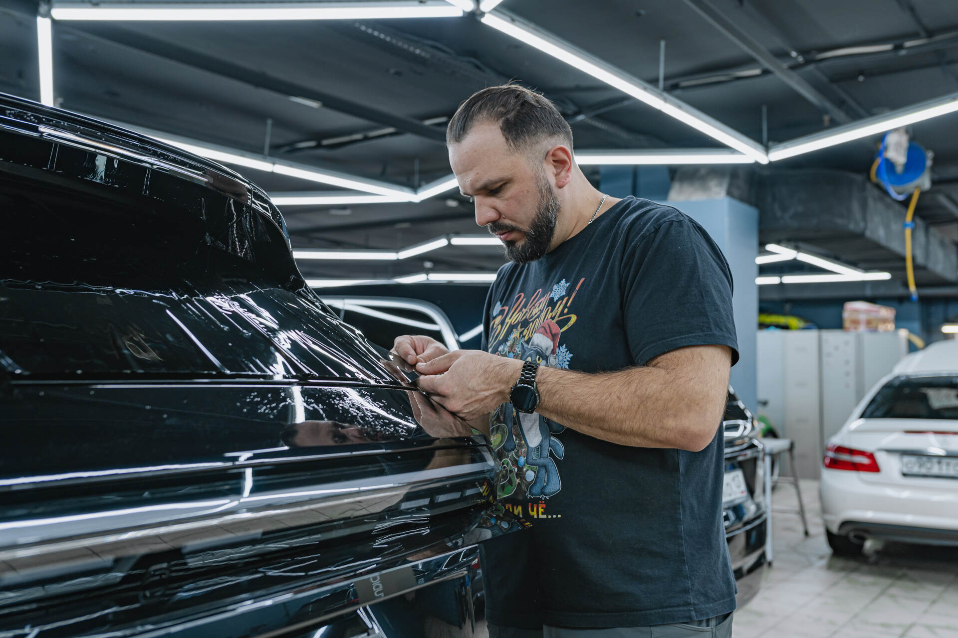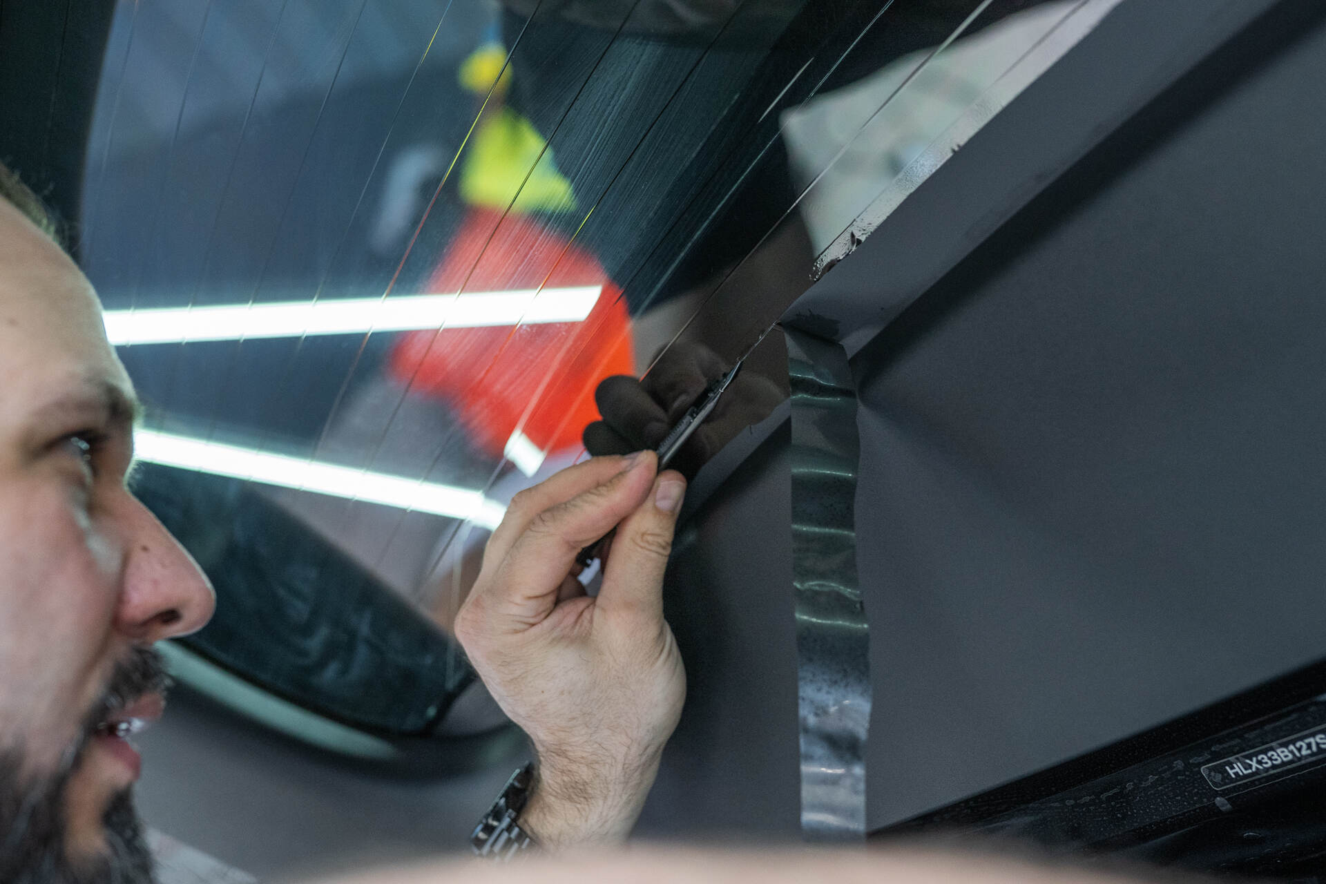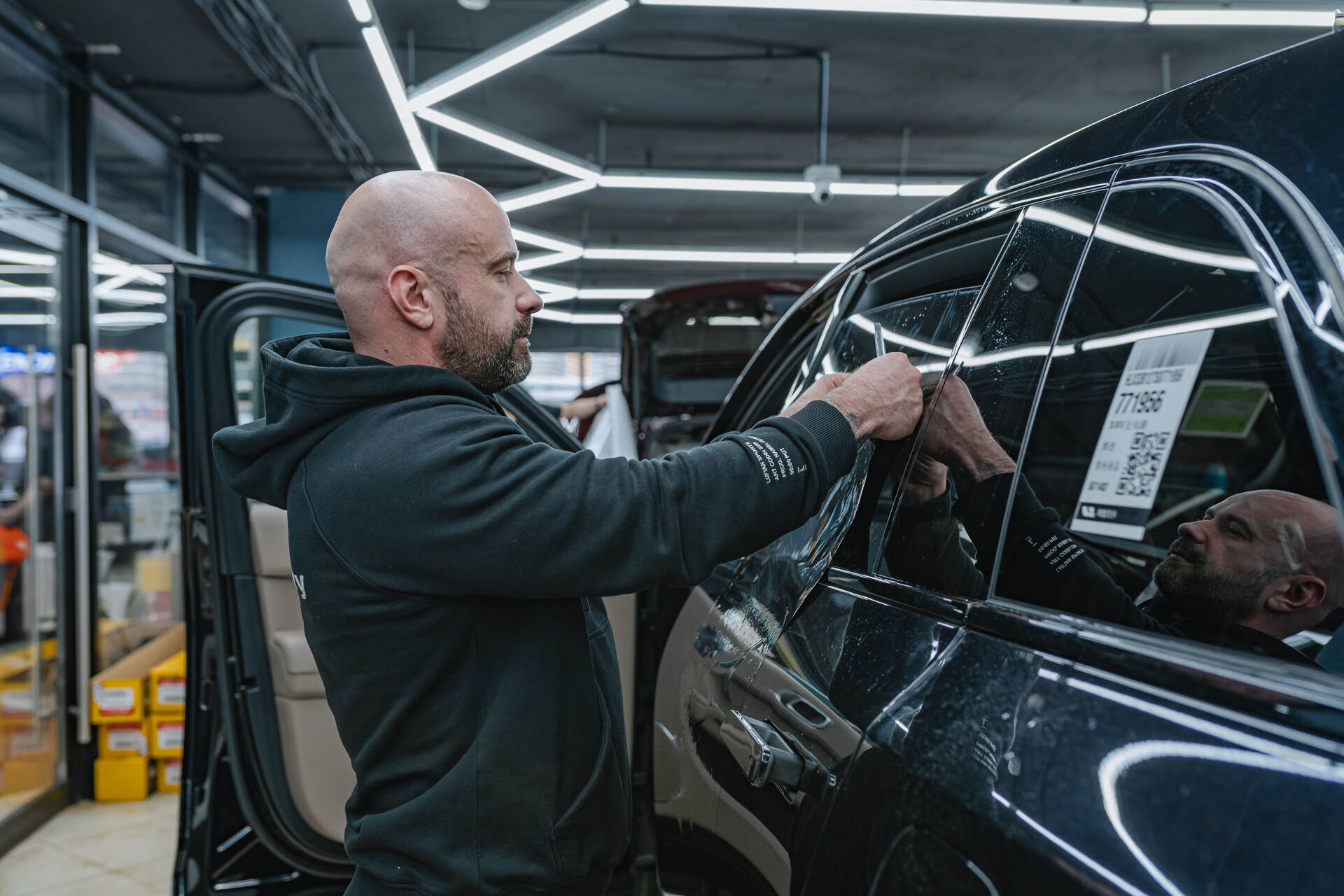 Подготовка пленки к монтажу начинается с её прогрева и обработки мыльным раствором, что придает материалу нужную эластичность для точного позиционирования на стёклах. После нанесения покрытия на стекла мастера тщательно разглаживают поверхность, аккуратно пряча края под салонную обивку. Финальным штрихом становится повторная термическая обработка всей площади промышленным феном. Под воздействием высокой температуры клеевой слой LLumar ATR05 окончательно полимеризуется, образуя со стеклом единое сверхпрочное соединение. Такой технологический цикл гарантирует идеальную фиксацию и безупречный вид тонировки, исключая риск отслоения краев в процессе дальнейшей эксплуатации автомобиля.