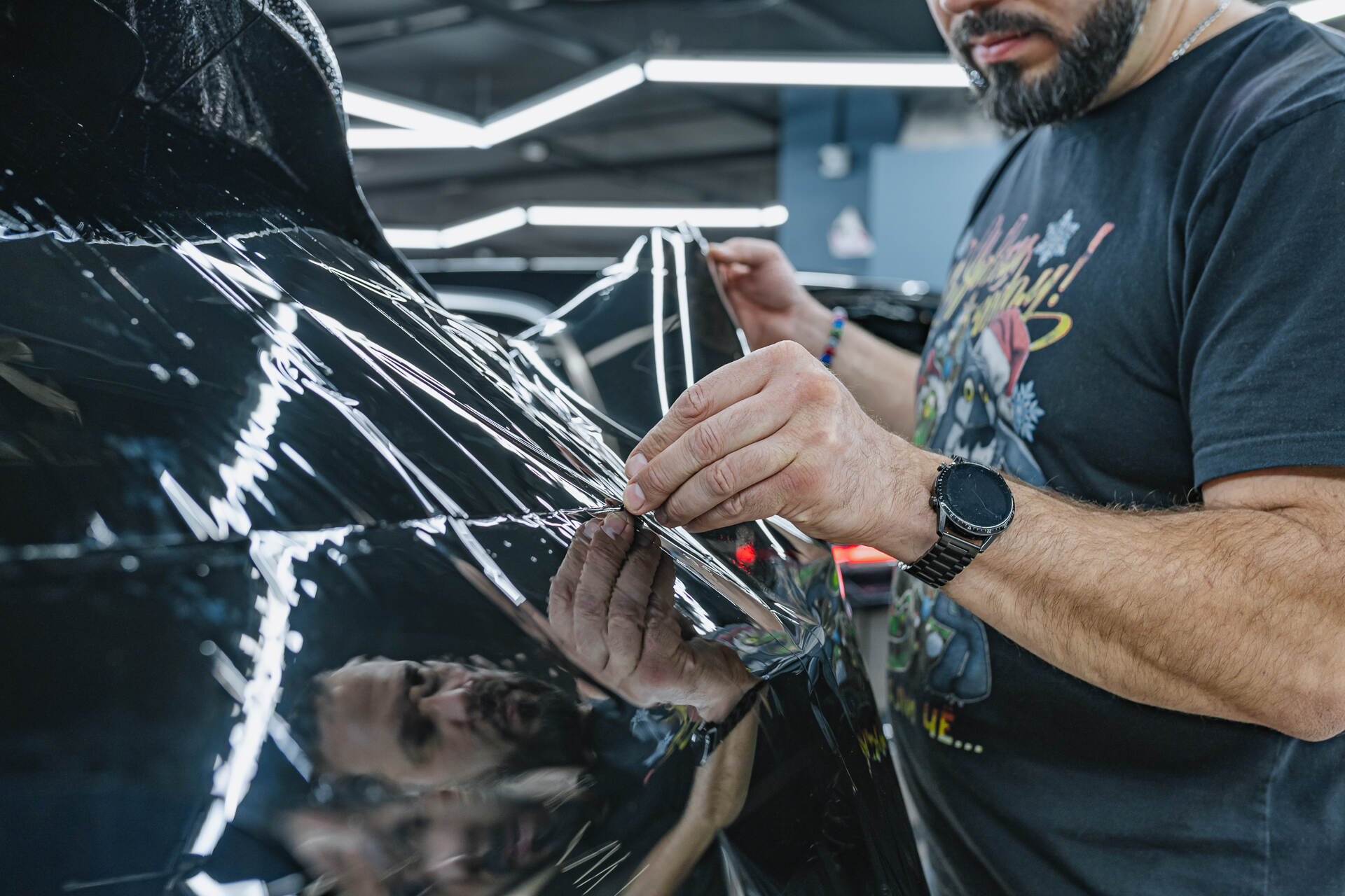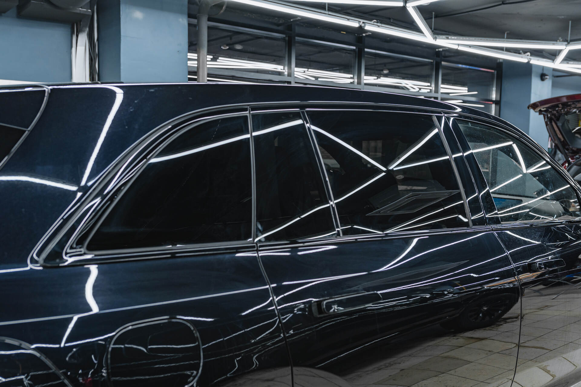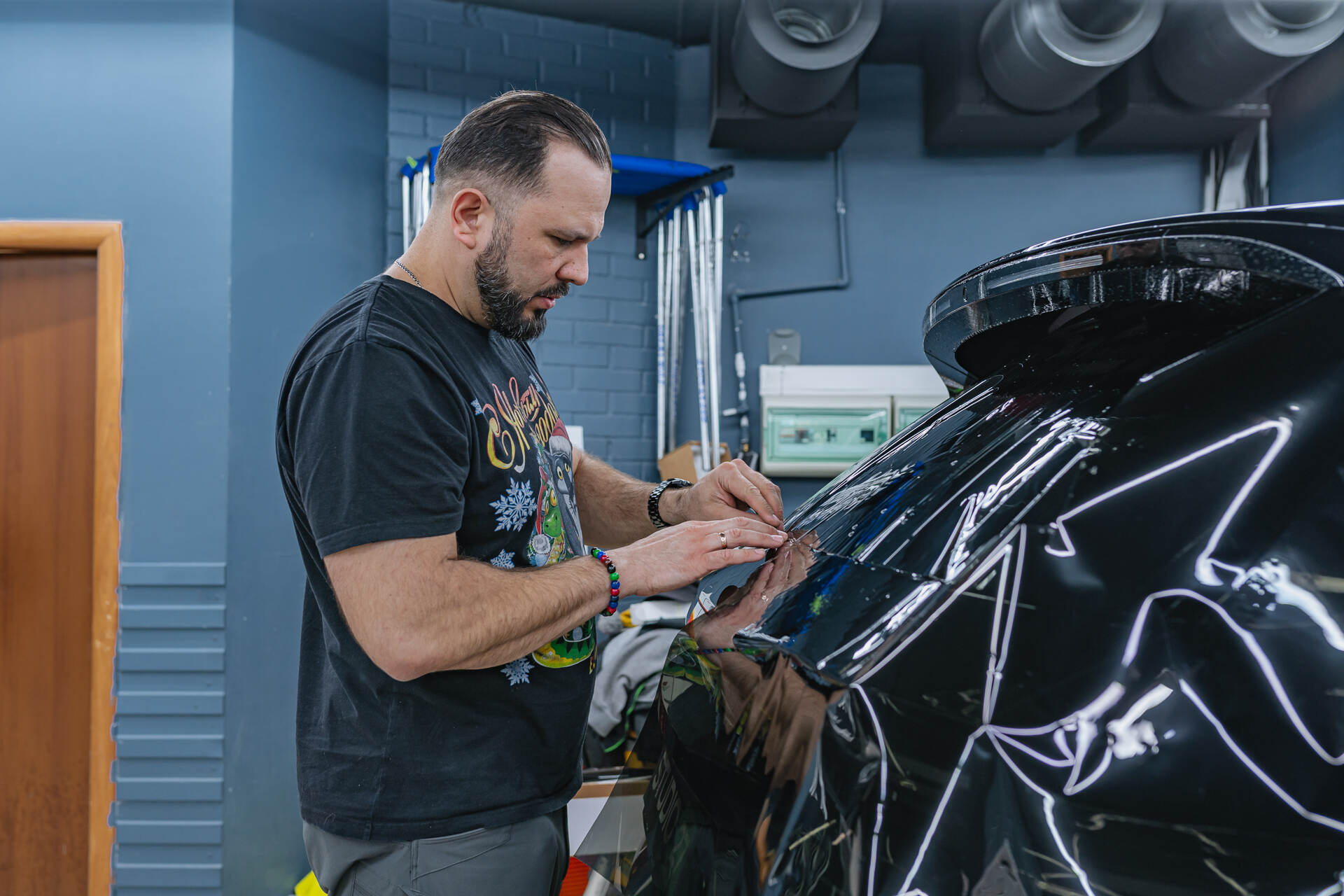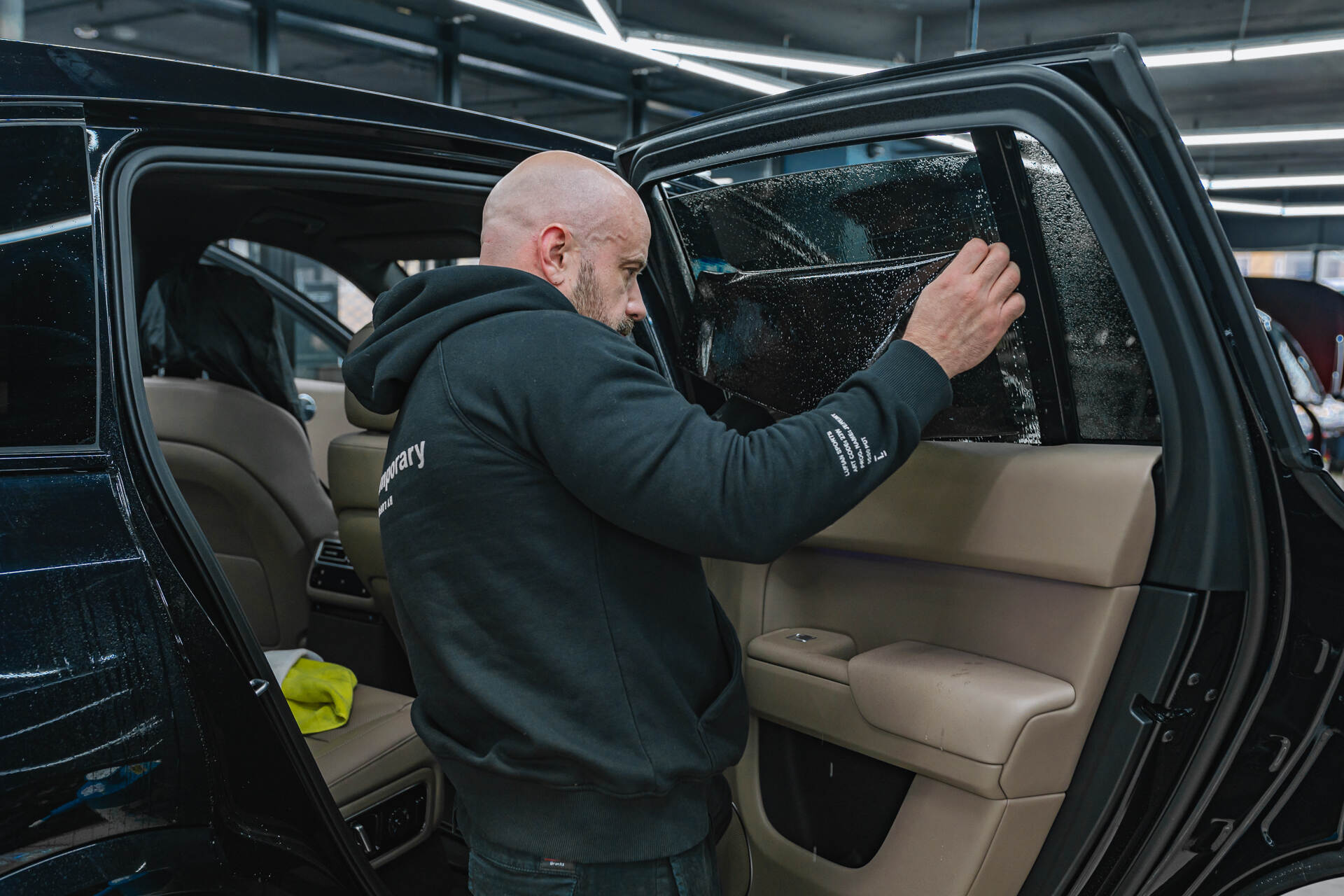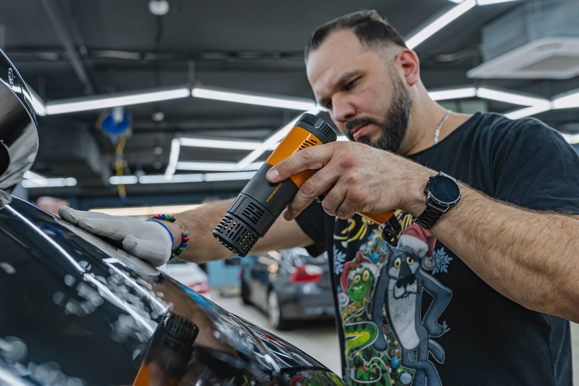 Подготовка пленки к монтажу начинается с её прогрева и обработки мыльным раствором, что придает материалу нужную эластичность для точного позиционирования на стёклах. После нанесения покрытия на стекла мастера тщательно разглаживают поверхность, аккуратно пряча края под салонную обивку. Финальным штрихом становится повторная термическая обработка всей площади промышленным феном. Под воздействием высокой температуры клеевой слой LLumar ATR05 окончательно полимеризуется, образуя со стеклом единое сверхпрочное соединение. Такой технологический цикл гарантирует идеальную фиксацию и безупречный вид тонировки, исключая риск отслоения краев в процессе дальнейшей эксплуатации автомобиля.