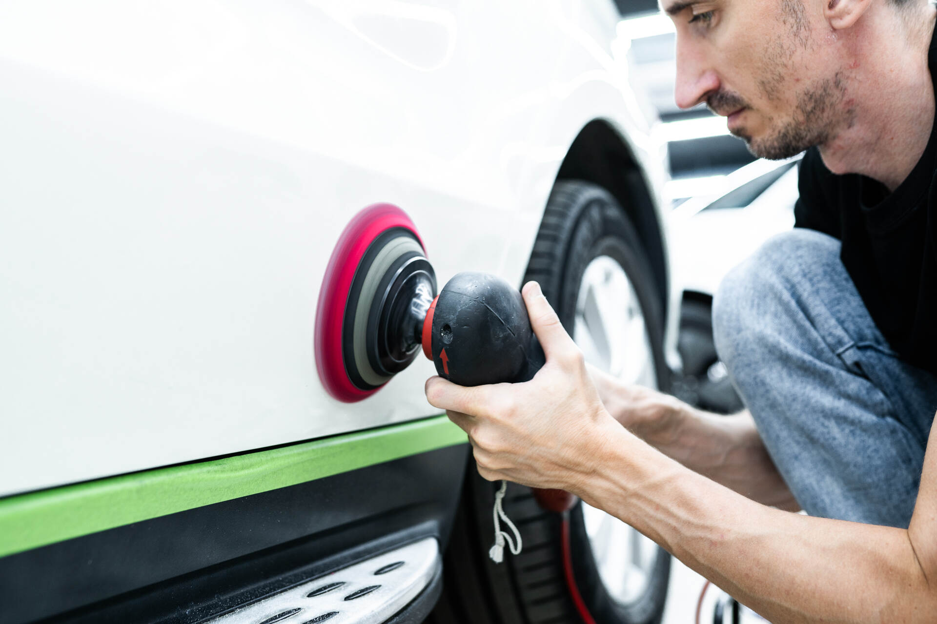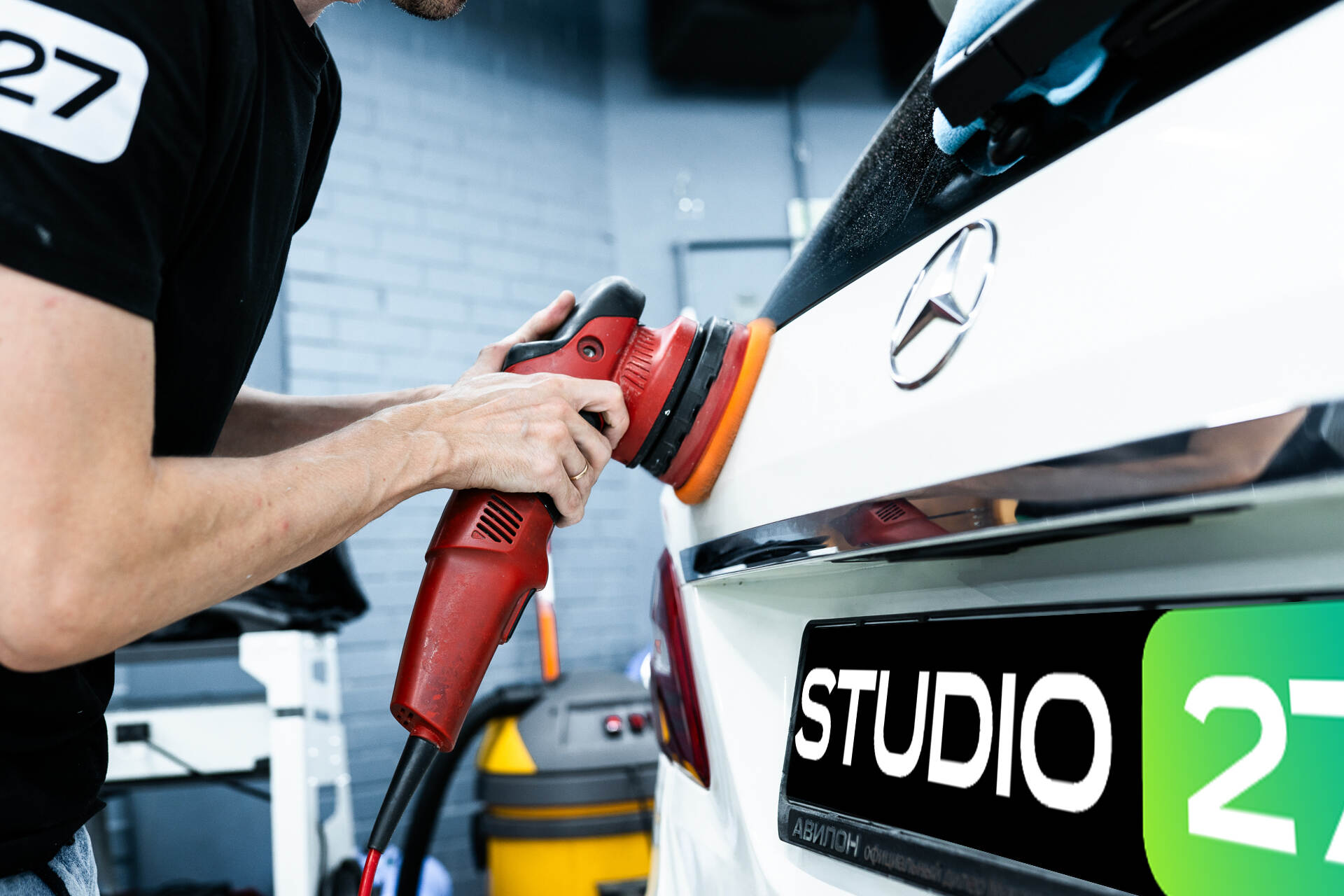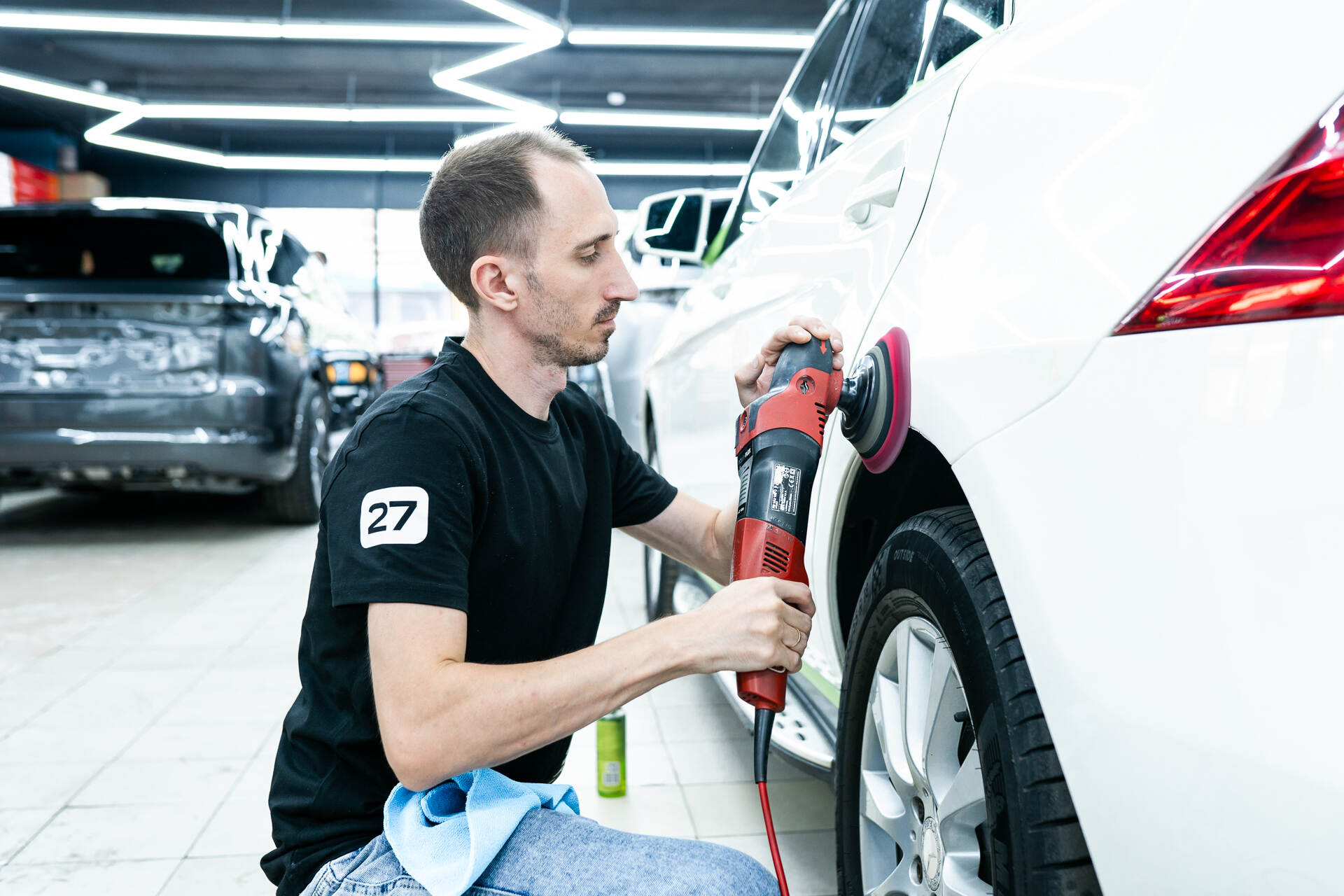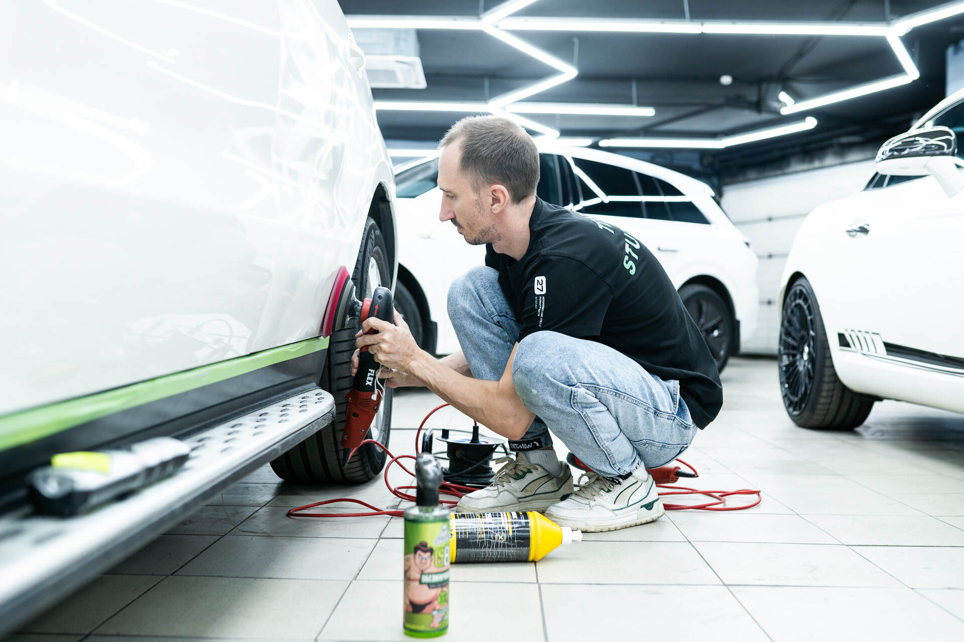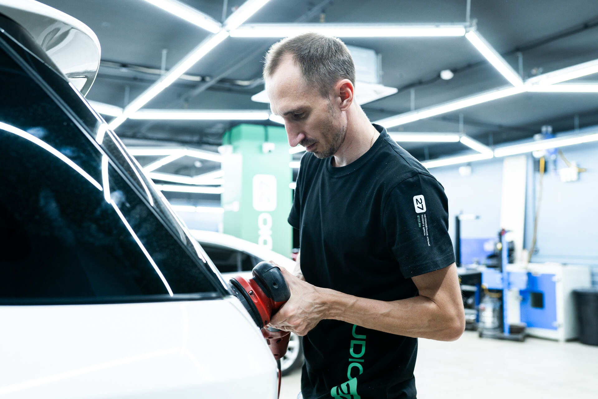 Учитывая наличие визуальных дефектов на кузове, вызванных значительным пробегом, мы в первую очередь проведем глубокую абразивную полировку. Полировка устранит мельчайшие следы воздействия абразивных частиц и мелких камней, создавая идеальную основу для последующего нанесения керамического покрытия. Степень обработки всегда определяется индивидуально — текущее состояние кузова диктует необходимый объем работ. В данном случае полировка представляет собой тщательную обработку поверхностей с применением профессионального инструментария. Полировальные круги различного диаметра в комбинации с специально подобранными абразивными составами эффективно удаляют потертости и царапинки от пескоструя, восстанавливая первоначальный блеск покрытия; такой подход обеспечивает безупречную подготовку поверхности для финального этапа — нанесения керамики на кузов.