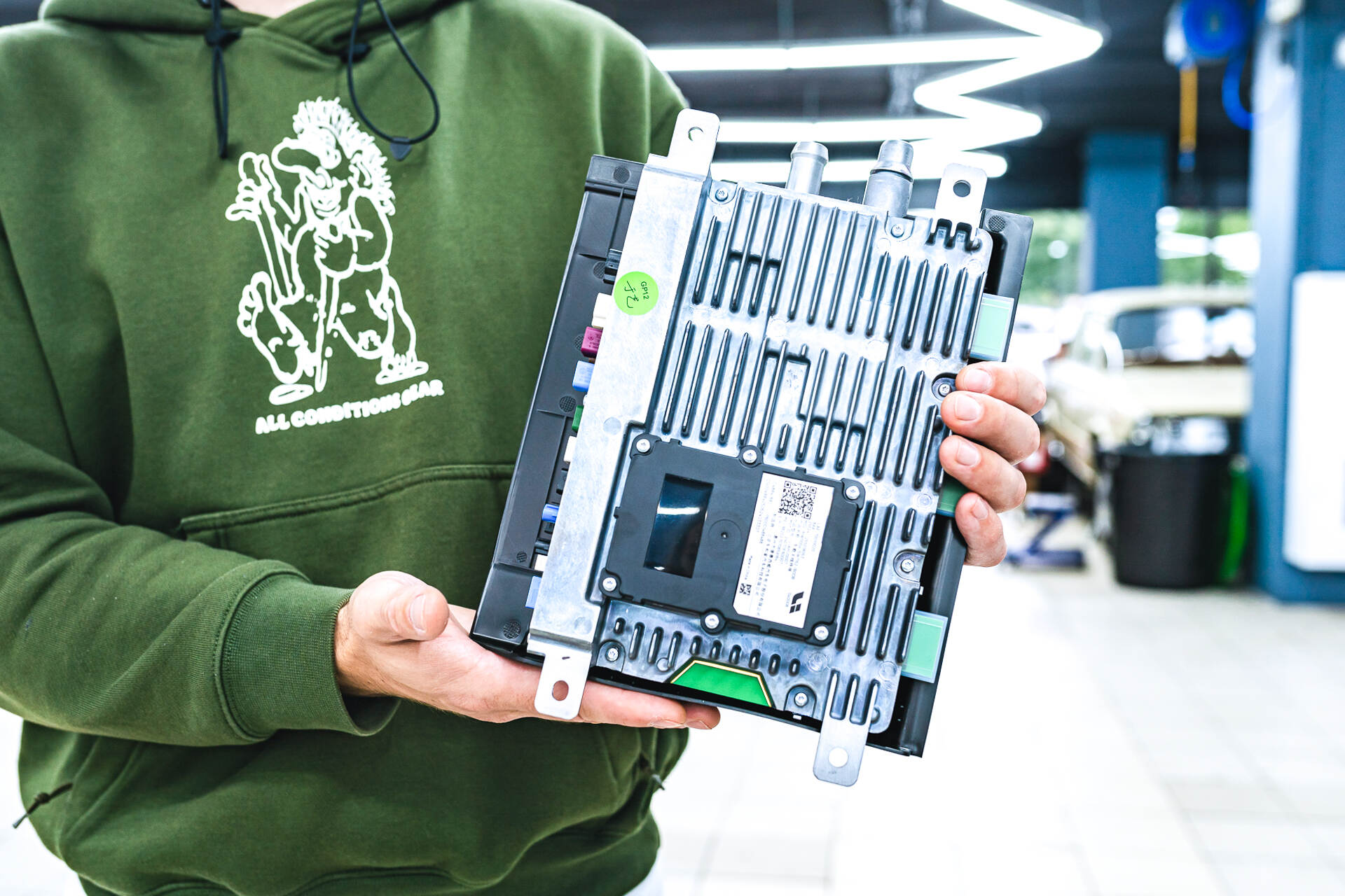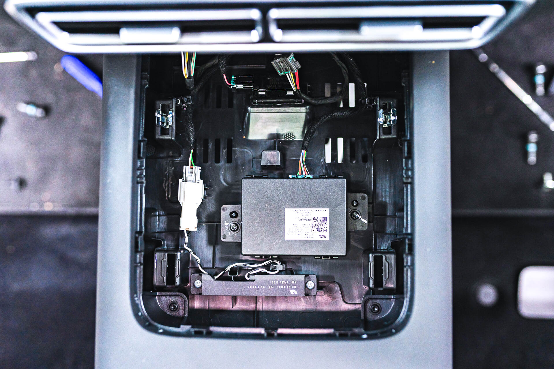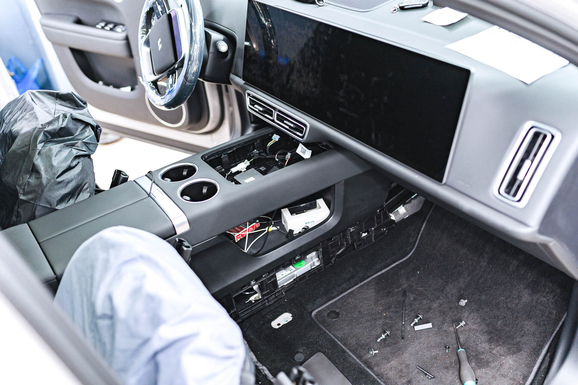 Мы интегрируем в Lixiang L7 специальный SIM-модуль с безлимитным 4G-доступом, что обеспечивает полноценную работу пакета приложений Carmods и открывает возможность установки любых программ из магазина Google Play. Это решение позволяет, в частности, использовать различные стриминговые сервисы для комфортного просмотра видео пассажирами во время поездки. Процесс интеграции SIM-карты в Лисян Л7 требует последовательных действий. Первоначально необходимо обеспечить доступ к телематическому блоку, для чего выполняется частичная разборка передней части салона — демонтируются сиденья и элементы обивки. Как только мы добираемся до модуля возникает основная сложность: блок соединен с системой охлаждения через трубки с антифризом.